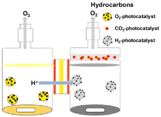 Contrary to batch reactors the re-adsorption of products and other aforementioned issues can be curtailed in continuous flow reactor system []. Despite that, the yield reported is still inadequate since these types of systems only allow for short residence time of reactants i.e., restricting reactants to make proper contact with photocatalysts. However, better performance can be obtained by optimizing the reaction conditions and using robust photocatalysts [,]. In another study, a twin reactor, as shown in Figure 4, was designed to avoid the possible re-oxidation of the photocatalytic products. The photocatalytic CO2 reduction results revealed that the production of hydrogen and oxygen in separate compartments and then use of as produced hydrogen in CO2 reduction increased the yield of the products [].