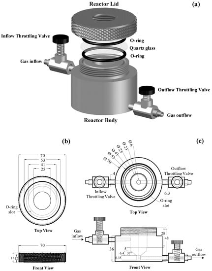 Reactor diagram and its blue prints, (a) Complete reactor diagram, (b) Lid dimensions, and (c) Reactor body dimensions.