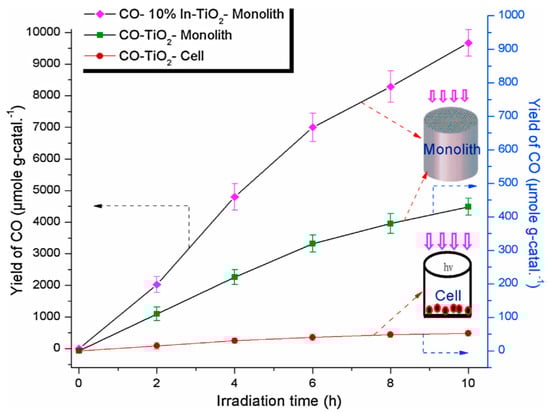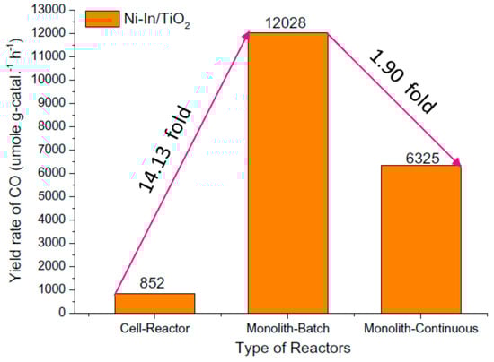 Tahir et al. studied the effect of photocatalyst dispersion by comparing performance of TiO2 coated micro channel monolith and cell type support (dispersed as single layer over stainless steel cell). Their study revealed a significant enhancement in CO production by TiO2 coated monolith as shown in Figure 7. This increment was mainly attributed to a broader exposed photocatalyst surface available for photocatalytic reaction []. In their study with gold-indium TiO2 dispersed over monolith, higher yields were reported particularly formation of C2 and C3 products. This enhancement was linked to effective utilization of photons owing to larger illuminated area of monolith []. A similar result of enhancement in CO2 reduction to CH4 was reported for montmorillonite modified TiO2 that was loaded over monolith as compared to the bare one [].However, their performance is still restricted by limited light penetration despite the high flow rates, minimal pressure drop, and large surface area [,,].