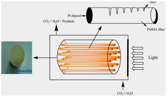 Ola et al. combined the mutual effects of higher surface area of monolith and effective light distribution of fiber optics to fabricate internally illuminated monolith reactor, and compared the CO2 reduction performance of this system with slurry reactor. It was found that internal illumination, by optical fibers, of the monolith reactor enhanced quantum efficiency to 23 times owing to the higher surface area of monolith and even the distribution of light by optical fibers []. Liou et al. inserted carved polymethylmethacrylate (PMMA) made optical fibers into NiO/InTaO4 coated monolith (honey comb structure) as shown in Figure 8. This reactor when applied for photocatalytic CO2 reduction enhanced the yield of products (methanol and acetaldehyde). An enhancement in the yield can be attributed to increased surface area, higher photocatalyst loading and effective utilization of the light [].