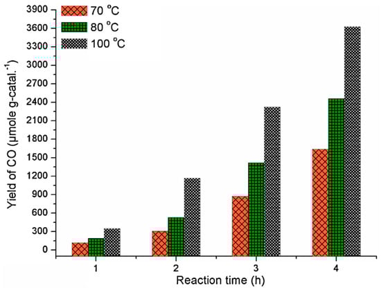 Concentrating solar light also increases the temperature depending upon the CR, due to long wavelength irradiations [,,]. Photocatalytic CO2 reduction at an elevated temperatures is promising as it overcomes the thermal barriers that lead to slow reaction rate and marginal yields []. The efficacy of temperature rise for photoreaction can be underscored on the basis of enhanced effective collisions among photogenerated charges and reactants that directly relate to the reaction rate [,]. Furthermore, elevated temperature also facilitates the desorption of the products providing the way for the adsorption of the CO2 on vacant sites leading to increased reaction rate [,]. Wang et al. found that production rate almost doubled when the temperature was increased from 25 °C to 75 °C []. Desorption of methanol from the photocatalyst surface increases due to increase in temperature, thus providing more active sites for CO2 photoreduction. The AQY in turn also increased due to more efficient utilization of the incident light and enhanced CO2 adsorption as result of methanol desorption. However, the reaction temperature should not increase too much as it might also desorb the CO2 thus decelerating the photoreduction process. Similarly, Guan et al. attained a temperature up to 590 K for photocatalytic reduction of CO2 and they found temperature rise to be an effective factor for enhancing the yield of solar products []. They suggested that such an enhancement was due to the increased collision frequency of photons and diffusion rate of CO2 towards the surface active sites. Hence the thermal energy along with light irradiation can significantly improve the solar products yield by efficiently overcoming the kinetic barrier for CO2 photoreduction reactions. In another study Alxneit et al. revealed the rate of CH4 formation via photocatalytic CO2 reduction increase when the temperature was increased from 25 to 200 °C. Upon further increasing the temperature, the reaction rate decreased due to desorption of the reactants. However, with the aforementioned temperature range, the reaction rate increases with increasing temperature which indicates the importance of thermal step tending to decrease the surface coverage from intermediate species and products. These results clearly suggest that temperature dependence is one of the pivotal factors that influences the photocatalytic reaction rate and thereof the product yield []. In another study, Tahir et al. also confirmed the efficacy of temperature rise in photocatalytic CO2 reduction for enhanced CO production over In/TiO2 as shown in the Figure 9 []. Such an observation was again explained on the basis of adsorption-desorption phenomenon. Upon increasing the reaction temperature, the mass transfer of CO2 on the active sites is increased, which leads to increased CO2 adsorption, resulting in increased reaction rates. They also observed the raising temperature also transformed the product selectivity towards longer chain hydrocarbons. Similarly Zhang et al. reported, when temperature increased from 323 K to 343 K, the yield of the photocatalytic reaction became twice []. They also suggested that enhancement in the product yield is due to desorption of products on the photocatalyst surface, providing more chances of collisions between the excited states and adsorbed reactants. Although raising temperature is an effective strategy to obtain higher yields, different studies suggest that there is always an optimum temperature range to get the best AQY [].