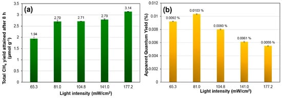 Effect of different light intensities at (a) CH4 yield and (b) apparent quantum yield(AQY) at variable light intensities, reproduced with permission from reference []. Copyright Elsevier, 2016.