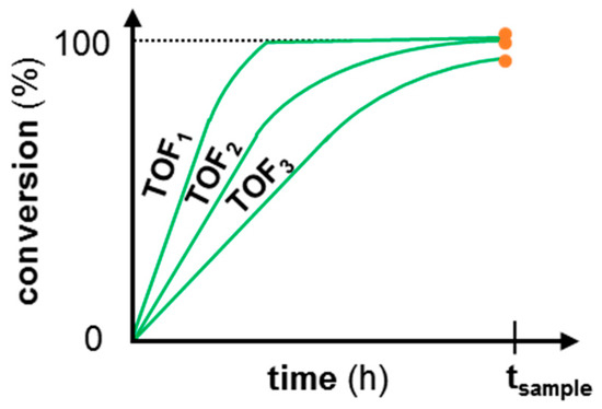 Hypothetical catalyst activity (turnover frequency—TOF) in a first and two recycle batch experiments for the reaction A → B. Only one sample is taken for each run after a time tsample, and is indicated in orange.