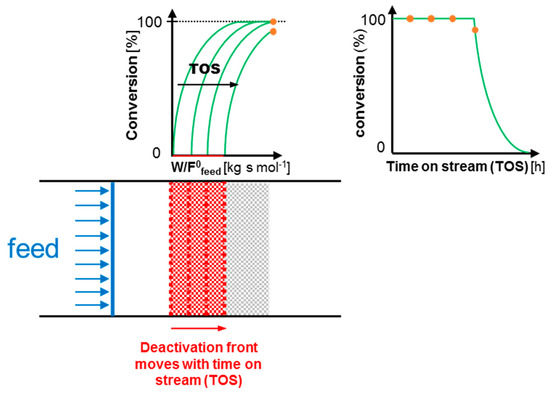 While time-on-stream measurements in continuous-flow reactors are sometimes used to assess the stability of heterogeneous catalysts, often conditions are chosen such that the behavior is thermodynamically controlled, i.e., that complete or equilibrium reactant conversion is obtained [29,30,31,32]. Yet, similarly to batch experiments, it is important to not operate at these high, or equilibrium, conversion levels, because it does not provide the required kinetic information to adequately assess deactivation [21]. This is visualized in Figure 2, where hypothetical catalyst activity curves are drawn as a function of space time (W/F0feed) and time on stream (TOS) for the reaction A → B. The deactivation is, in this example, assumed to be caused by an undesired side-reaction of a reactive intermediate on the catalyst surface, which results in the deactivation moving as a front through the catalyst bed. Nonetheless, the conclusions drawn from this example are generally applicable to any catalyst deactivation behavior in a plug-flow reactor.