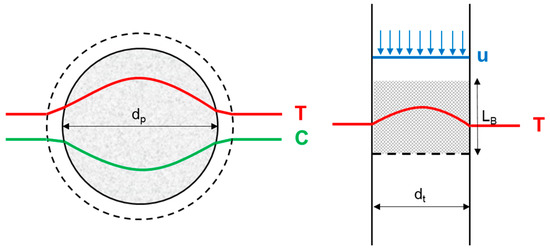 To aid in the assessment of whether intrinsic kinetics can be attained for a specified liquid-phase reaction in a packed-bed tubular reactor, correlations can be used. To ensure plug-flow conditions with a uniform velocity profile (u) over the catalyst bed such as displayed in Figure 3, ideal mixing in the radial direction and no mixing in the axial direction is required. Both these criteria can be evaluated with correlations from Mears et al. [37,38] which depend on the reactor tube diameter (dt), the catalyst pellet size (dp) and the bed length (LB). The pressure drop (Δp) over the catalyst bed is evaluated with the Ergun equation [39] and should not exceed 20% of the total operating pressure for first order reactions. Radial isothermicity is verified by a criterion derived by Mears et al. [40], and axial temperature gradients can be reduced by diluting the bed with inert particles [40]. This bed dilution, however, should also be limited to avoid an improper catalyst distribution which can affect the conversion [41]. The absence of both radial and axial temperature gradients can also be experimentally evaluated with internal thermocouples in the catalyst bed.