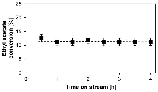 The ethyl acetate conversion as a function of time on stream is displayed in Figure 4. The steady conversion from 1 h on stream up to 4 h on stream, indicates that the Lewatit K2629 catalyst is, effectively, stable in this timeframe.