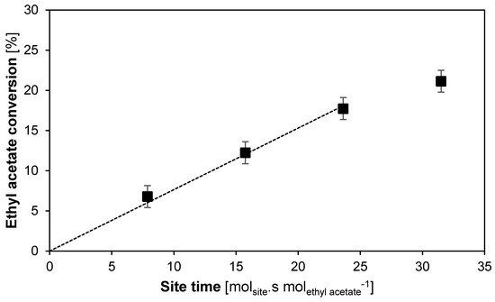 Determining the TOF of a stable catalyst in a plug-flow reactor can straightforwardly be performed by measuring the slope of the initial linear part of the conversion graph at different catalyst site times (see Figure 5). This way, the TOF for the transesterification between methanol and ethyl acetate using octane as a solvent over the Lewatit K2629 catalyst is determined at 6.2 ± 0.4 × 10−3 s−1. This value is in the expected range for this type of transesterification reaction catalyzed by an acidic resin [61,62,63,64]. Only the slope of the first three sample points in Figure 5 is used for the linear fit of the TOF, because the sample at a site time of 31.5 molsite s molethyl acetate−1 is in the so-called integral reactor regime, where the decrease in reactant concentration causes a decrease in the reaction rate [7].