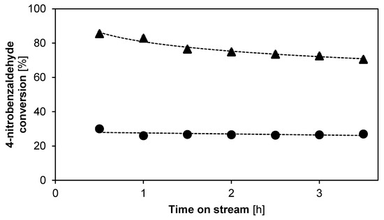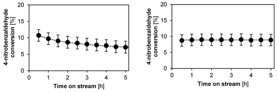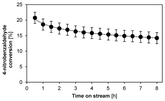 Figure 8 indicates the 4-nitrobenzaldehyde conversion as a function of the time on stream for the monofunctional base catalyst, evaluated without solvent, i.e., in 100 vol % dry acetone. The initial catalytic activity is higher than in the case of DMSO as solvent, but still lower than with hexane. This can be attributed to the polarity of acetone, which is in-between that of DMSO and hexane [69]. Moreover, its activity does not appear to stabilize, even after 8 h on stream and indicates a steady catalyst deactivation. This can be attributed to the stabilization of the iminium ion intermediate which, coupled with a low water concentration, will lead to a similar catalyst deactivation as in the case of DMSO as solvent [5].