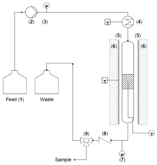 The feed section essentially comprises a flask with the reactant mixture (1 in Figure 10) connected to an Eldex 2SMP plunger pump (2 in Figure 10). The flask is gently stirred to avoid the development of concentration gradients within the reactant mixture. The positive displacement pump can deliver flow rates between 0.01 and 10 mL/min with discharge pressures up to 400 bar. To reduce flow fluctuations, a pulsation damper is installed on the pump. A manometer (3 in Figure 10) is coupled to this damper, which measures the pump discharge pressure and is able to impose a high-pressure limit above which the pump operation is stopped. The piston is made from sapphire, and the inlet and outlet valves incorporate sapphire seats with ruby balls. The piston seal material is made from graphite fiber reinforced polytetrafluoroethylene (PTFE) and all the tubing is made of type 316 stainless steel. Seals are either a chlorotrifluoroethylene (CTFE) or Kal-Rez® type. All these internal parts are checked for their chemical compatibility with the employed reagents in this work.