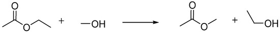 Model transesterification of ethyl acetate and methanol towards methyl acetate and ethanol.