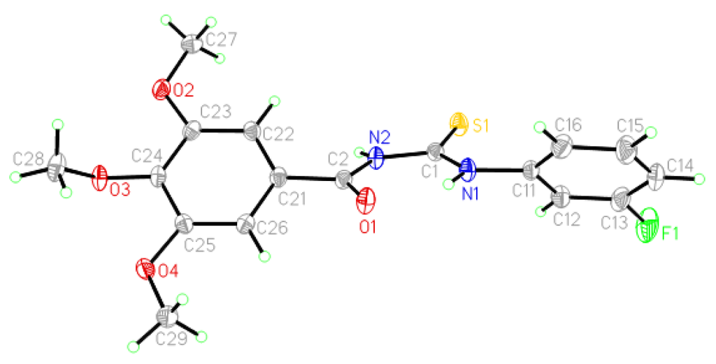 The title thiourea was synthesized by reaction of 3,4,5-trimethoxybenzoyl isothiocyante with 3-fluoroaniline. The 3,4,5-trimethoxybenzoyl isothiocyante was produced in situ by reaction of 3,4,5-trimethoxybenzoyl chloride with ammonium thiocyanate in dry acetonitrile. The structure was confirmed by the spectroscopic, elemental analysis and single crystal X-ray diffraction data. It crystallizes in the monoclinic space group P21/c with unit cell dimensions a = 13.0966(9), b = 16.6460(13), c = 7.8448(5), β = 106.721(5)°, V 1637.9(2) Å3, Z = 4.1. Introduction
