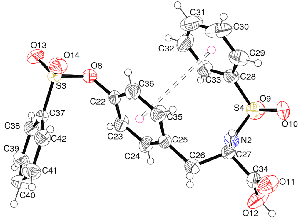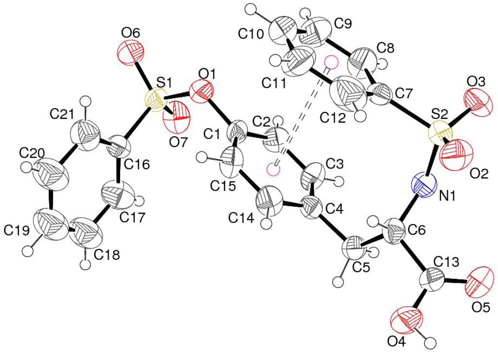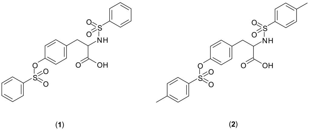 In this paper, we report the syntheses and crystal structures of benzenesulfonylamino-3-(4-benzenesulfonyloxy-phenyl)-propionic acid (1) (see Figure 1 below) and 2-(toluene-4-sulfonylamino)-3-[4-(toluene-4-sulponyloxy)-phenyl]-propionic acid (2), in which the L-tyrosine core is substituted at both its N and Oh atoms. Their structures are compared to those of the related compounds noted above.