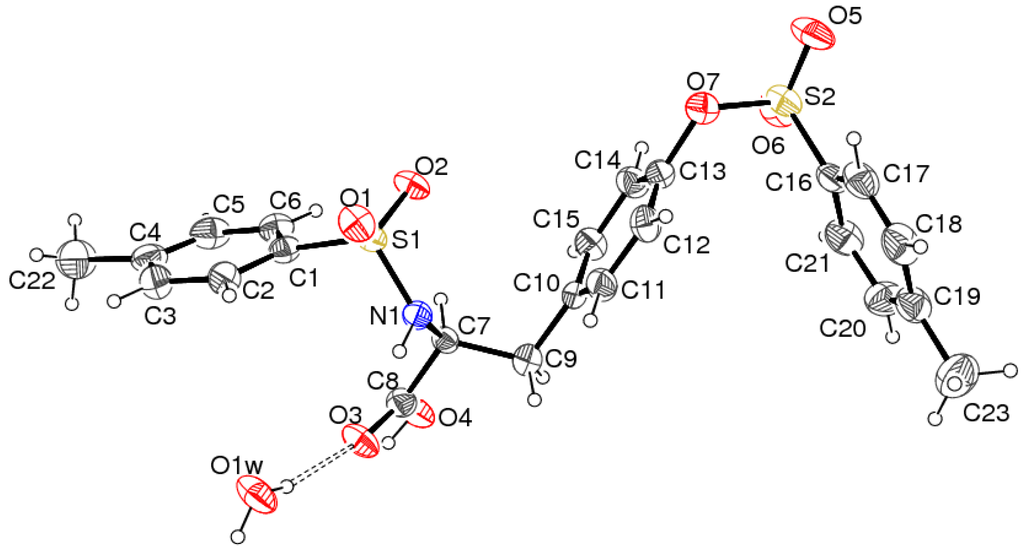 The crystal structure of 2·H2O (Figure 4) shows that L-tyrosine has reacted with two equivalents of 4-toluenesulfonyl chloride to form the S1–N1 and S2–O7 bonds in the product and that a water molecule of crystallization is present. The S-configuration of the C7 stereogenic center [refined value of the Flack absolute structure parameter = −0.01 (7)] is consistent with that of the L-tyrosine starting material and the bond lengths and angles in 2 may be regarded as normal. The molecule of 2 is non-zwitterionic, i.e. the proton is clearly attached to O4 and not to N1, as also seen for related molecules [5-7]. In order to simplify the comparison with related structures, atoms C8, C7 C9 and C10 in 2 are referred to as Ca, Cα, Cβ and Cγ, respectively.
