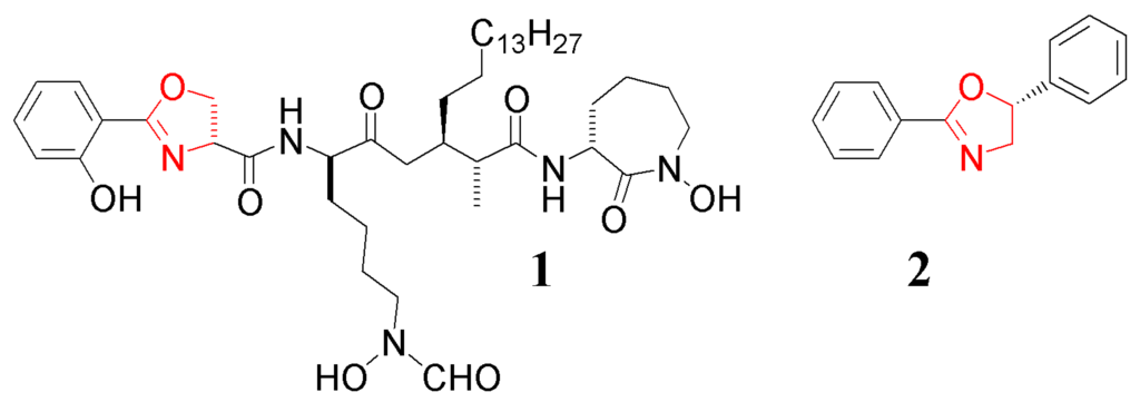 - Frump, J.A. Oxazolines. Their preparation, reactions, and applications. Chem. Rev. 1971, 71, 483–505. [Google Scholar]