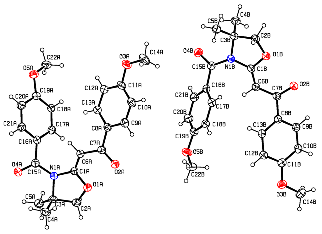 The crystal and molecular structure of the title compound, viz., (2Z)-2-[3-(4-methoxybenzoyl)-4,4-dimethyl-1,2,-oxazolidin-2-ylidene]-1-(4-methoxyphenyl)ethanone (4), is reported. Compound 4 crystallises from toluene/hexanes mixtures in the P21/c space group with eight molecules in the unit cell. The unit cell parameters are: a = 20.9410(11) Å, b = 8.7523(5) Å, c = 21.2291(9) Å; β = 93.529(3)° and V = 3883.5(3) Å3. There are two structurally distinct molecules of 4 found in the solid-state which differ primarily in terms of the observed torsion angles and the overall intramolecular spacing between the aromatic groups. Bond lengths and angles of this tertiary amide are otherwise typical. This is the first crystallographically characterised example of this class of oxazoline precursors, which have previously found application in the syntheses of other heterocycles. Density functional theory (b3lyp 6-311++G** level of sophistication) has likewise been applied to estimate the gas-phase structure of the title compound.1. Introduction