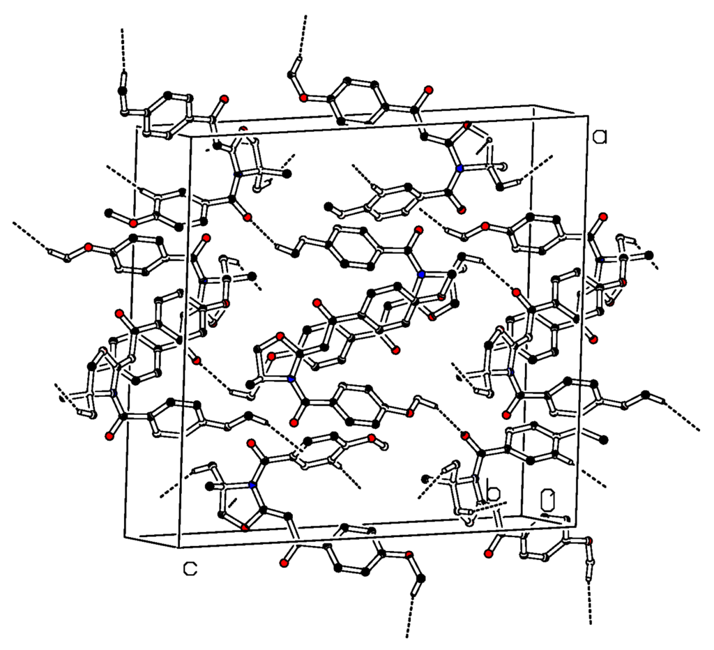 These differ primarily in the torsion angles observed and the relative spacing of the two intramolecular aromatic rings (Table 1). Specifically for Molecule A, the O2A-C7A-C8A-C9A, C6A-C7A-C8A-C13A and N1A-C15A-C16A-C17A torsions are all narrower (20.6(5)°, 22.0(6)° and 33.9(5)°, respectively) than their respective angles observed for Molecule B (24.2(6)°, 28.8(5)° and 38.2(5)°, respectively). In the case of Molecule A, the relative spacing and twisting of the two aromatic rings results in a longer C22A•••O3A distance (6.66 Å) than that observed for the same spacing in B (6.27 Å). The heterocyclic rings in both molecules display deviations from planarity of 9.7° (Molecule A) and 8.0° (Molecule B) [21] as measured by their respective N1-C1-O1-C3 torsion angles. The bond lengths observed (Table 1) for the various functional groups are well within the expected ranges for such bonds and hence are otherwise unsurprising [28]. A crystal packing diagram is found in Figure 3. This molecule was also subjected to examination of its gas-phase structure using Density Functional Theory (DFT) at the b3lyp 6-311++G** level of sophistication. The calculated bond lengths and angles also appear in Table 1. The DFT measurements do a reasonable job at mimicking the solid-state structure (Table 1); interestingly rotation of the C6-C7 bond to a situation in which the C7-O2 ketone functionality is rotated approximately 180° relative to that of Molecules A or B is found to be a more stable gas-phase configuration by approximately 3.0 kJ/mol. The gas-phase form is also predicted, perhaps not surprisingly, to have a longer C22•••O3 distance (dcalc = 9.00 Å). Of the three torsion angles mentioned above, the gas-phase form is closer to that of Molecule A with the respective values of 15.8°, 20.1° and 22.0°. The calculated deviation from planarity of the heterocycle (estimated similarly via the N1-C1-O1-C3 torsion, vide supra) is 12.5°.