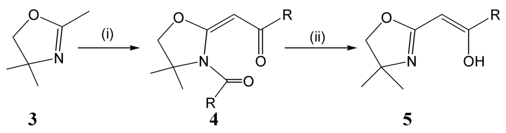 Sometime ago, Tohda and co-workers presented [22] a facile two-step strategy for the synthesis of enol-containing oxazolines initiating from 2,4,4-trimethyl-2-oxazoline (3). This protocol (Scheme 1) involves the (i) treatment of 3 with base (NEt3) in the presence of two equiv. of a benzoyl- or alkoyl-chloride to yield an intermediate ethanone. This latter compound is then hydrolysed with excess alcoholic base (ii) to yield the desired enol-oxazoline product (5: Scheme 1). Materials such as 4 have found application in the production of other heterocycles [23] and as general synthetic intermediates [24-27]. A compound of general formula 4 (Scheme 1) has not previously been the subject of study via single crystal X-ray diffraction. In this report, we detail the solid-state properties of an example of crystalline 4 in which the R group (Scheme 1) is −C6H4OCH3-p (i.e., 4: derived from 4-anisic acid).