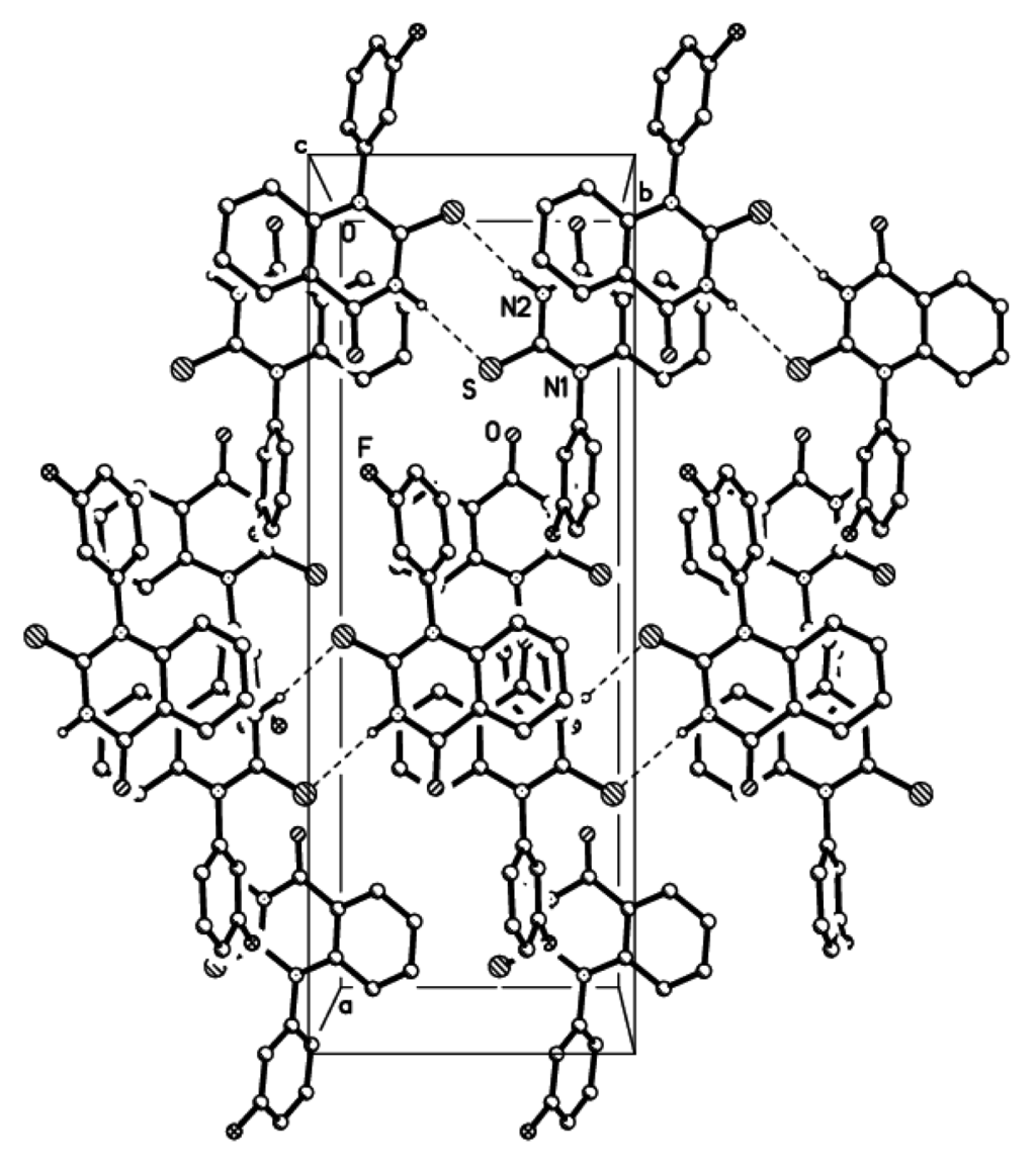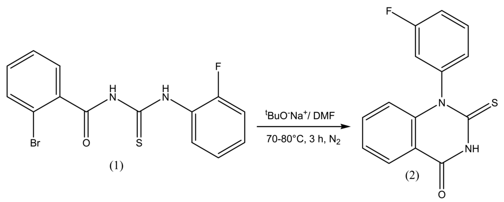 The base catalyzed intramolecular nucleophilic cyclization of 1-(2-bromobenzoyl)-3-(2-fluorophenyl)thiourea (1) in the presence of N,N-dimethyl formamide (DMF) afforded the 1-(3-fluorophenyl)-2-thioxo-2,3-dihydroquinazolin-4(1H)-one (2) by an intramolecular nucleophilic substitution SNAr mechanism. The structure was supported by the spectroscopic data and unambiguously confirmed by the single crystal X-ray diffraction data. It crystallizes in the orthorhombic space group P na21 with unit cell dimensions a = 22.430(4), b = 8.1478(16), c = 13.522(3) Å, V = 2471.2(9) Å3. There are two independent molecules per asymmetric unit that are linked to centrosymmetric AB-dimers via intermolecular N-H…S bonds.1. Introduction
