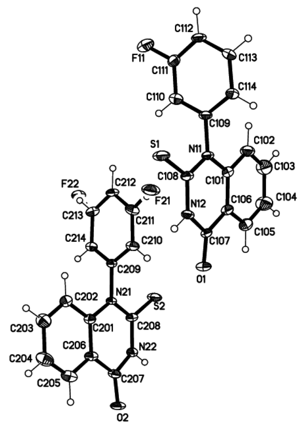 There are two crystallographically independent molecules A and B per asymmetric unit which exhibit almost equal geometries. Both the fluorophenyl rings make dihedral angles of 86.3(1)° (A) and 82.6(1)° (B) with the corresponding quinazoline planes. C=O and S=O bond lengths of av. 1.231(4) and 1.666(4) Å, respectively, correspond well to those from CCDC reference JESWEK [14] with equal thioxo group (Figure 2).