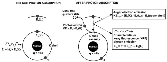 In Figure 1, the photon absorption is followed by the following atomic transitions: (1) the bound K-shell electron (called photoelectron) is ejected to a quantum state outside the atom; (2) the K-shell vacancy is filled by an electron from the L3 sub-shell; (3) the energy loss of the L3 sub-shell electron prompts two competitive processes: (a) Auger electron emission which refers to the ejection of an electron in an upper sub-shell and (b) characteristic or XRF photon emission. The XRF photon energy and the kinetic energies of the photoelectron and the Auger electron can be written as a function of the electron binding energies involved in these transitions by employing energy conservation. These relationships indicate how XRF photon and Auger electron emissions identify unique atomic transitions and, therefore, the atoms themselves. Several notes regarding the XRF and the Auger electron emissions are included in the next few paragraphs.