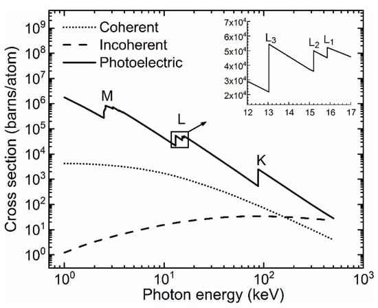 The photon energy for which photoelectric absorption occurs resulting in a vacancy in a particular shell or sub-shell, is called the K-edge for K-shell electrons, L1-edge for L1 sub-shell electrons, etc. The edge energy is slightly lower than the corresponding atomic electron binding energy, the small difference accounting for the fact that the photoelectron does not transition to an entirely free quantum state (i.e., null binding energy at an infinite distance from the atom). The photoelectron emission and initial vacancy can also occur in sub-shells of the upper L, M, or N atomic shells. The probability of a vacancy in the sub-shell of an atom can be computed from the photoelectric cross section dependence on the photon energy. The textbook by Podgoršak [26] is a useful reference on this topic and includes sample calculations of the K shell and L and M sub-shell vacancies in the lead (Pb) atom. The incident photon can also undergo coherent (or elastic) and incoherent (or Compton) scattering events. These interactions need to be accounted for in XRF and XAS measurements and subsequent data analysis. The cross sections (in units of barns per atom) for each of the three photon interactions as a function of the photon energy (E) for the Pb atom in the wide energy range from 1 keV to 500 keV, are drawn in the plot of Figure 2 below. The data was taken from the XCOM: photon cross sections database of the National Institute of Standards and Technology (NIST) [27].