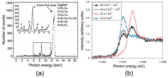 Examples of XRF and XAS spectra are shown in the plots of Figure 3a,b, respectively. The spectra were taken from two different synchrotron-based studies: Gherase et al. [30] and Ponomarenko et al. [31] and targeted As microscopic distribution in human nails and the corresponding As speciation, respectively. Both studies used cross sections of human fingernail clippings from volunteers living in the vicinity of Sackville, New Brunswick, Canada. The emitted XRF photons form the observed Gaussian peaks in the spectrum shown in Figure 1a. The XRF photon energies are on the keV scale and can identify the elements in the sample in concentrations as low as a few µg/g. By applying appropriate calibration and analysis, spectral data can also provide quantitative information expressed as relative elemental concentrations or absolute elemental mass concentrations.
