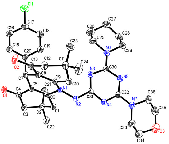 The 3D structure of compound 4 was represented by the ORTEP diagram (Figure 1). Structurally, compound 4 was found to be comprised of 1,8-dioxo-decahydroacridine (N1/O1-O2/C1-C13) moiety substituted with planar p-chlorophenyl ring (Cl1/C15-C20) at C7 and dimethyl groups (C21-C22/C23-C24) at C2 and C11 atom, linked via N1-N2 linkage to planar s-triazine ring (N3-N5/C30-C32). The piperidinyl ring (N6/C25-C29) was found in twist-boat conformation at C30 and morpholino moiety (N7/O3/C33-C36) in a chair conformation at C32 atom, respectively. The torsion angle between N1/N2/C6/C31 was found to be 112.8(2)°. A list of dihedral angles is given in Table S1 (Supplementary Data).