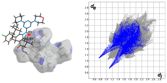 The dnorm maps (left) and FP plots (right) of the O1…H1 (1.831 Å) and Cl1…H28A (2.791 Å) contacts in the studied molecule.