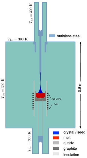 For the Czochralski growth of high purity Ge single crystals, a growth furnace was constructed at IKZ. Details were described elsewhere [7]. A sketch for the axisymmetric calculation is presented in Figure 1. The current setup with a quartz crucible of a 90 mm inner diameter was used to grow 2 crystals. The only graphite part in the setup was the susceptor holding the crucible. Heat was generated in the graphite part by inductive heating using a coil with 9 windings made of silver. A frequency of 80 kHz was applied. Crystals were pulled with a constant pulling velocity of , except when the bottom cone was grown to empty the crucible. The position of the crucible was fixed during the entire process of crystal growth. As a result, the melt level was decreasing in time, resulting in a higher growth velocity of the crystal than the pulling velocity. The rotation rates of the crystal and crucible were 15 rpm and −2 rpm, respectively (counter rotation). The radius of the crystal was controlled by adapting the heating power. This was done manually. In the finishing process, the Ge melt was pulled out completely.