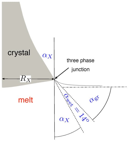 - Hurle, D.T.J. Analytical representation of the shape of the meniscus in Czochralski growth. J. Cryst. Growth 1983, 63, 13–17. [Google Scholar] [CrossRef]