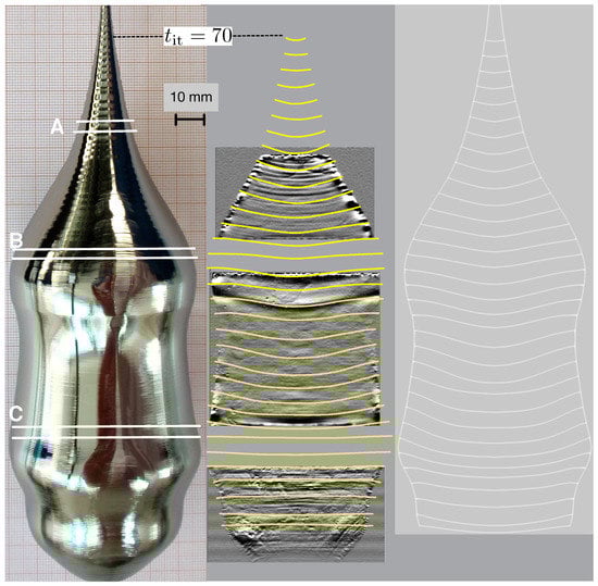 We considered two experimental runs for our numerical simulations. The examples were chosen out of a series of growth experiments for the process development, which was started with argon as the atmosphere and was later changed to hydrogen. In one case, we grew a crystal of 513 g total weight in an argon atmosphere (Case 1) and in the other one a crystal of 1530 g total weight in a hydrogen atmosphere (Case 2). Firstly, we discuss the results of Case 2. The crystal shape of the final crystal can be seen on the left hand side of Figure 3. Three wafers were cut out of the crystal as indicated by the horizontal yellow lines. These wafers were used for the measurements of the etch pitch density (EPD), which we will discuss later. Three vertical cuts were made, in the cone, the cylindrical part, and the final cone. All three were polished chemo-mechanically and used for LPS measurements. In the middle of Figure 3, the outcome of LPS is shown together with the computed interface lines (yellow). A good agreement can be observed over the entire growth process. Some minor differences can be seen in the middle of the shouldering. For comparison, on the right hand side, the interface lines are presented, which were obtained by running the calculation using for computing the latent heat as was done in the standard computational scheme (). A significant difference in the shapes can be observed in the later stages of the growth, especially towards the end. The shape of the interface is of major importance for the von Mises stress in its vicinity. In Figure 4, the von Mises stress is shown for three different locations at the interface for the two runs with computed and with . The stress was always higher for except for a short time period. Because of the high temperature, the von Mises stress in the vicinity of the interface was the most critical for the multiplication of dislocations.