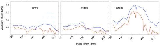 Average von Mises stress at the interface as a function of the growth stage (crystal length) for Case 2. Left: At the centre At the centre (r = 0–3 mm); middle: around (r = 10–13 mm); right: near the rim (r = 18–21 mm). The lower red curve is for the case with computed and upper blue one for the case with .