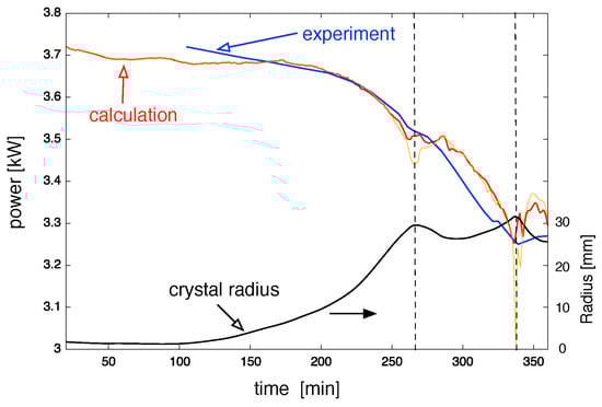 We also compared the change in the required power during the process time. Please note that the experimental value was given by the electrical current and voltage in the entire circuit, whereas the numerical values were the sum of the induced heat in the graphite and melt. For comparison, we shifted the experimental values by 350 W. The comparison is shown in Figure 5. After shouldering, the required power went down. There was some instability when reaching the cylindrical part, which was more pronounced in the numerical calculation than in the experiment. This might be because we did not perform fully transient calculations and did not take the change of the interface shape into account for the computation of . The growth velocity was computed before the thermal calculation with Elmer starts and was not adapted later. This meant that the latent heat production corresponded to the evolution of a flat interface. Latent heat effects due to changes in the interface shape were not considered. The second instability occurred near the end of the process. For a better comparison, the crystal radius is also plotted in Figure 5. Please note that the plot was versus process time and not versus crystal length. Therefore, the shape given by the plot of the crystal radius differed from that of the crystal shape. We also show the result if only the change in the melt level was taken into account for computing and the change of the meniscus height was neglected (light orange curve). In the regions where the crystal radius was going from an increasing to a decreasing one, a strong peak in power occurred. In these regions, the large change of led to a significant change of (see Equation (1)) and the melt volume beneath the crystal. Therefore, taking into account the effect of this melt volume in the computation of the growth velocity had a strong impact on the power consumption.