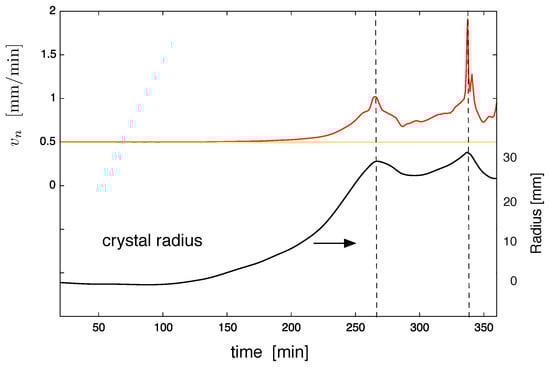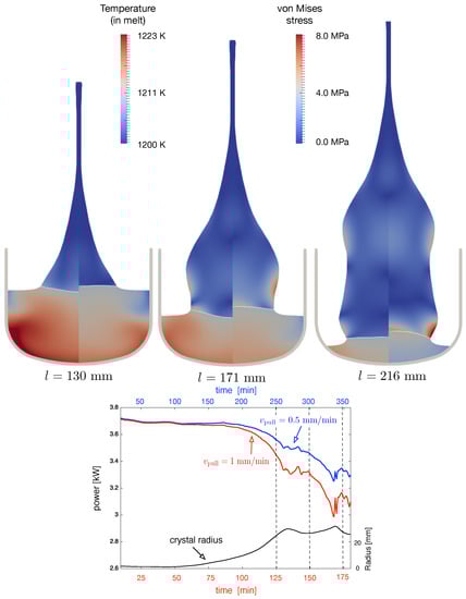 One of the key process parameters was the pulling velocity. The higher the velocity, the larger the amount of latent heat released and the lower the required power. For Case 2, we computed the process again for a pulling velocity of . In Figure 6, we show at the bottom the power consumption as a function of the process time. Please note that for the same length of the crystal, the process time was different for the two cases. The dotted lines indicate the growth stage where the von Mises stress in the crystal and the temperature in the melt are shown on the left hand side. For each stage, the left part and right part show the results for and , respectively. The reduced power consumption for had a strong impact on the temperature in the melt (see Figure 6 top). The melt would freeze at the top in the vicinity of the crucible. This meant that the position of the crucible should be changed when applying a high pulling velocity. The von Mises stress depended significantly on the growth stage and was sometimes larger in one case and sometimes in the other. We would like to note that we took the shape of the crystal as observed in the experiment with . Therefore, a general statement on stresses and possible dislocation multiplication cannot be made. However, the situation for the melt/crystal interface was clear: the interface for was always concave, whereas for , it was always convex. We would like to mention that with the algorithm developed, we could give any crystal shape as an input and check the optimal pulling velocity. As an illustration of how the growth velocity was changing during the growth process in Case 2, we show the as a function of the process time in Figure 7. One can see that the main deviations from the pulling velocity were in the regions of increasing radius.