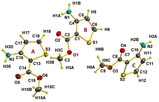 Asymmetric unit and atom-labeling for matc. Atomic displacement ellipsoids are depicted at the 50% probability level. A, B, and C in orange designate the three different molecules in the asymmetric unit.