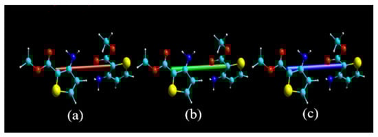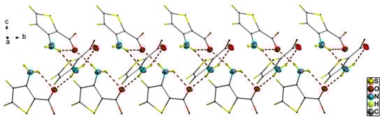 Crystal structural determination revealed that matc crystallizes in the monoclinic crystal system P21/c space group. Its asymmetric unit consists of three crystallographically independent matc molecules, as depicted in Figure 1. Generally, The C=O groups were located in the same plane as the ring, and all of the C–S, C–N, and C–O bond lengths fell within the ranges of 1.7113(19)–1.7395(16), 1.347(2)–1.354(2), and 1.344(2)–1.446(2) Å, respectively. All three matc molecules were almost structurally identical, and only a very slight difference was found (Tables S1 and S2, See Supplementary Materials). Amongst them, deviations on the bond distances and angles of the N–H and C–H groups were obvious due to the difference in the refining method, and the largest distance between analogous atoms in superimposed molecules was about 0.063 Å. Additionally, the C=O bond lengths were 1.226(2), 1.222(2), and 1.219(2) Å, respectively, due to the strong hydrogen bonds. A simple survey revealed that the related compounds [,,] containing the 3-methoxy-2-thiophenamine fragment often had the intramolecular N–H⋯O hydrogen bond, forming a seven-membered ring. This is a benefit due to the amine and carbonyl groups that are on the same side as thiophene. The strong N–H⋯O and N–H⋯N hydrogen bond interaction, as shown in Figure 2 and Table 2, was responsible for the crystal packing. All of the three molecules in the asymmetric unit exhibited an S(6) motif by an intramolecular N–H⋯O–C hydrogen bond. These three molecules were further linked together by two intermolecular N–H⋯O hydrogen bonds and one N–H⋯N hydrogen bond, leading to the three common D motifs. Hence, the first-level graph set was DDDS(6)S(6)S(6). Based on the intermolecular N–H⋯O hydrogen bonds, the basic motif in this structure was an infinite chain including all three crystallographically independent molecules. Intermolecular N–H⋯N interaction joined this helical chain with a similar helical chain into a double chain running in the b-axis direction (Figure S1). Further, a weak C–H⋯S contact with a distance of 3.5794(18) Å between C and S atoms, along with C–H⋯Cg interactions, stabilized the crystal 3-D packing (Table 2 and Figure S1), where Cg is the centroid of the thiophene ring.