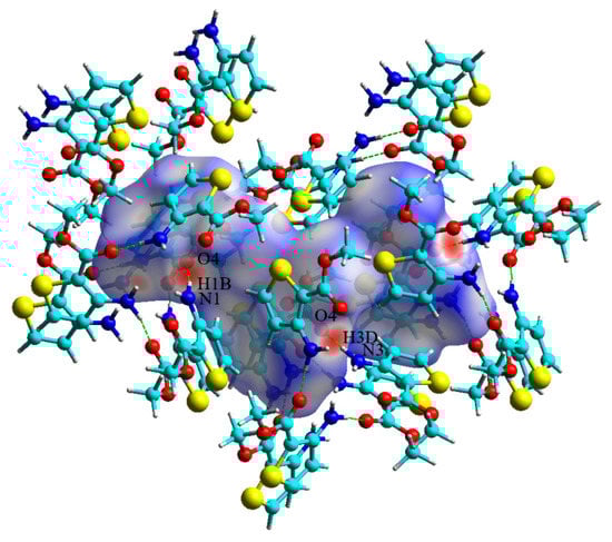 To analyze weak interactions, the reduced density gradient (RDG) is a popular method []. The configuration of a trimer including three matc molecules was optimized at the B3LYP/6-31G* level and analyzed. In Figure 6, the more blue isosurface indicates the stronger hydrogen bonds, while the more red isosurface reveals the larger steric effect, and the green isosurface corresponds to a weak van der Waals interaction. In Figure 6b, a red shuttle-shaped region in the middle of the ring reflects the strong steric hindrance effect, corresponding to the red spike of the scatter plot in Figure 6a. On the RDG isosurface, the blue color between the carboxyl and amino groups of a neighboring molecule implies the formation of an intermolecular N–H⋯O hydrogen bond. Similarly, the formation of N–H⋯N hydrogen bonds can also be seen in the adjacent area. This is in agreement with the determined crystal structure. The color between the carboxyl group oxygen (O) and ring hydrogen (H) of a neighboring molecule is a large area of green flat plate, which embodies the role of van der Waals interactions and intermolecular C–H⋯O contacts.