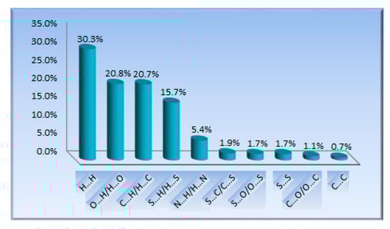The Hirshfeld surface analysis combined with fingerprint plots is a powerful tool to explore intermolecular interactions [,]. As shown in Figure 3, the bright red spots on the Hirshfeld surface correspond to N–H⋯O hydrogen bonds involving O⋯H/H⋯O contacts. These contacts are represented by two large spikes at the bottom of the fingerprint plot (Figure S2). The H⋯H contacts were the highest contribution to the molecular packing due to the abundance of hydrogen on the molecular surface [,,,]. Due to a significantly long distance and the prominent role of van der Waals interactions, the C⋯H/H⋯C and S⋯H/H⋯S contacts were not visible on the Hirshfeld surfaces. The N⋯H/H⋯N interactions were about the N–H⋯N hydrogen bonds, characterized by two small spikes on the sides of the fingerprint plot. The other minor contacts, such as C⋯S/S⋯C and S⋯O/O⋯S contacts, were only a very small contribution to the Hirshfeld surface in crystal. The percentage contributions of each interaction to the Hirshfeld surface are depicted in Figure 4.