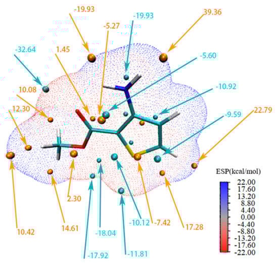 The electrostatic potential (ESP) is a very convenient descriptor for understanding sites of electrophilic and nucleophilic reactions and intermolecular interactions [,,]. Figure 7 provides the ESP-mapped vdW surface and surface extrema. The red region indicates the possible site for electrophilic attack, while the blue region for nucleophilic attack. Additionally, it can be seen that the global surface minimum value (−32.64 kcal/mol) was found at the oxygen atom of the carboxyl group, indicating the most favorable site for the positively charged species and the most possible acceptor. Meanwhile, the global surface maximum (39.36 kcal/mol) is about the hydrogen atoms of the amino group, corresponding to the stronger ability to attract negatively charged atoms and to the most possible donor. This observation clearly explained the reason why carboxyl and amino groups could form H-bonds prior to the other group in the matc crystal structure.