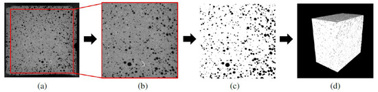 X-ray micro-computed tomography (micro-CT), a nondestructive investigation method, was used to estimate the spatial distribution of pores within the cement-based materials. This technique allows a series of cross-sectional images and microstructures to be obtained. Detailed pore characteristics, such as pore size distribution and pore density contour, were also examined using micro-CT images and imaging tools [43]. More details about this method can be found in [39], with only a brief explanation of the CT imaging procedure presented in this paper. Figure 1 shows the imaging process used in this study. First, a region of interest (ROI) is selected from an original image for effective examination of the sample. The original and ROI images were 8-bit images, represented by a value ranging from 0 (black) to 255 (white) in grayscale. Each image was composed of 1000 × 1000 pixels with a 27.0 µm pixel size. A binary image for classifying solids and pores was then generated, using the Otsu method [44] and an appropriate threshold value. The 3D sample for describing the pore structure was generated by consequent stacking of a series of binary images. Using the 3D images of the specimens, material characteristics, such as porosity and the spatial distribution of pores, can be effectively examined.