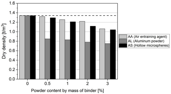 - An addition of aluminum powder increases air void contents more than other air-induced materials even with lower dosage. The addition of 0.5 wt.% of aluminum powder significantly reduces dry density, while higher dosages have negligible additional effects. The dry density of the specimens with air entraining agent and hollow microspheres are similar and reduced gradually with increasing the dosages.