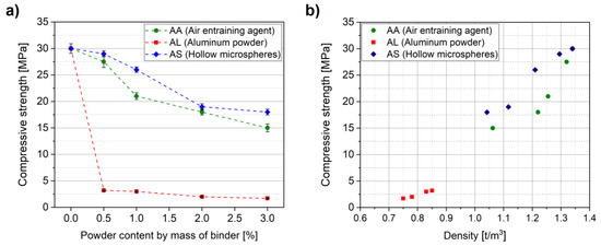 Compressive strength of the specimens with different additives: (a) compressive strength vs. powder content; (b) compressive strength vs. density.