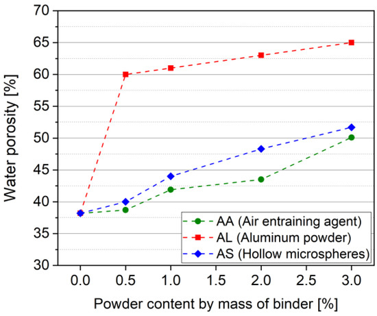 Three methods were used to generate air voids inside the cement paste. The first was the chemical expansion method, using aluminum powder with 0.5, 1, 2, and 3 wt.% binder content. The second method involved adding a tenside-based air entraining agent, with the same ratios as in the case of the aluminum powder: 0.5, 1, 2, and 3 wt.%. The third method involved adding prefabricated hollow plastic air bubbles (microspheres), with 0.5, 1, 2, and 3 wt.% mass of binder. Hollow microspheres are materials with spherical voids inside a plastic shell, having a diameter of 25–60 mm (median: 35 mm) and a density of 0.2 g/cm3 [40]. Each method of creating artificial voids produces a different volume of air inside the paste. The dosage of the materials used for producing the air was therefore kept constant to investigate their effects on paste porosity.