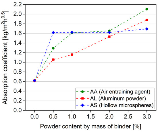 Figure 5 presents the water absorption coefficient values of the different cement pastes. Mix A0, without entrained air, had the lowest water absorption, of about 0.61844 kg/(m2·h0.5). However, mix AA3 with 3 wt.% AA had the highest water absorption coefficient, of about 2.10211 kg/(m2·h0.5). In contrast to the porosity results, mixes with the aluminum powder had a lower absorption than mixes with the AA. For mixes with the hollow microspheres (AS), the absorption was higher than in the control mix, though a marginal increase in absorption was observed with an increase in AS dosage. Compared to AA mixes, those with the AS had a lower absorption coefficient. The capillary suction force controls absorption rate and quantity, in the method used to measure water absorption (water uptake). As a result, pores in the capillary range are more effective in increasing the water absorption coefficient. In the case of aluminum powder, most of the pores were large in size, and as a result, the water absorption of these mixes was smaller than in the other mixes, where most of the pores were in the size range of the capillary pores. It is clear from the results that, the water absorption of composites made with hollow microspheres is increasing up to 0.5 wt.%. With increment of AS content no significant increase in the absorption can be detected. This can be attributed to the nature of microspheres which are closed pores with weak shell and cannot create a continuous passage for fluids to transfer. Most of these pores do not participate in increasing the water absorption as can be reflected from the experimental results and this can be considered as an advantage of this material compared to other air entraining materials.