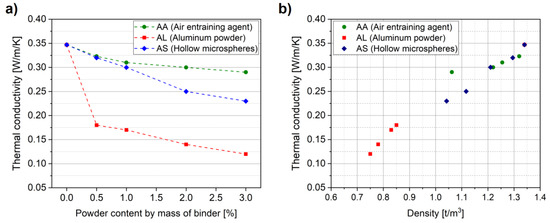 Thermal conductivity of the specimens with different additives: (a) thermal conductivity vs. powder content; (b) thermal conductivity vs. density.