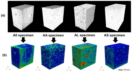 Target specimens (A0, AA3, AL3, AS3) and their 3D binarized CT images (solid structures): (a) 3D binarized CT images (solid structures) of A0, AA3, AL3, and AS3 specimens (Note: in the binary images, the white denotes solid phase, and the black parts represent the pores of each specimen); (b) description of pore densities of the specimens (Note: the color in each figure denotes pore density values between 0 (blue) to 1 (red)).