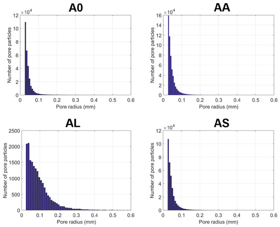 Pore size distribution of A0, AA3, AL3, and AS3 specimens.