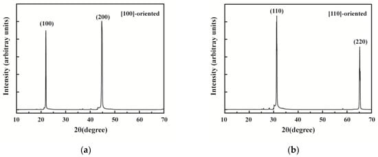 For the purpose of consistency and accuracy of the nanoindentation testing results, the main planes (6 × 4 mm) of the PIN–PMN–PT single-crystal specimens were ground and mechanically and electrolytically polished to a near-mirror finish. Figure 1 shows the X-ray diffraction (XRD) patterns from the main planes of [100]- and [110]-oriented PIN–PMN–PT single crystals by using X-ray diffractometer SmartLab 9KW (Rigaku, Akishima, Tokyo, Japan). It reveals that the PIN–PMN–PT single crystals with two different crystallographic directions in this study were exactly in the [100] and [110] directions and additionally had good phase purity.