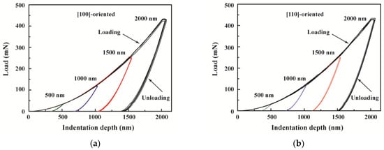 Load–indentation depth curves at different maximum depths for (a) the [100]-oriented PIN–PMN–PT bulk single crystal and (b) the [110]-oriented PIN–PMN–PT bulk single crystal during the nanoindentation test.