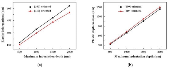 (a) Elastic deformation and (b) plastic deformation versus maximum indentation depth for the [100]- and [110]-oriented PIN–PMN–PT single crystals.